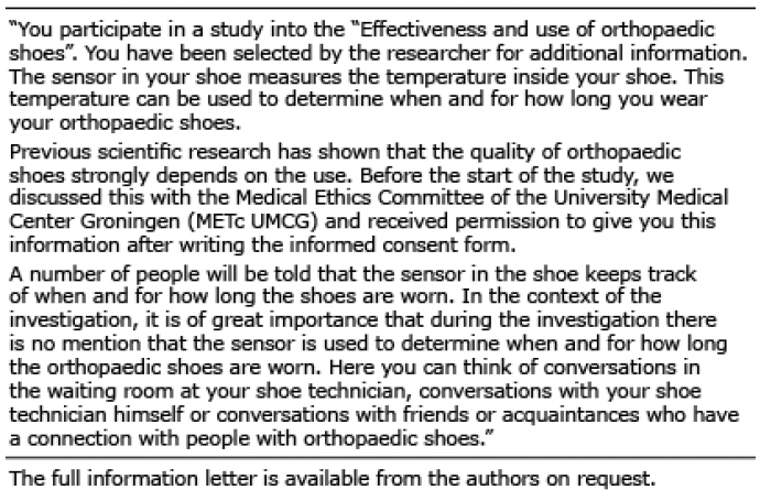 Eleven orthopaedic footwear companies, from across the Netherlands, approached their patients for participation in this study. If a patient met the inclusion criteria, the orthopaedic shoe technician would inform the patient and ask, during the first contact, whether the patient wanted to read the general information about the study (see Appendix I, and see below under “Intervention”). If the patient was interested, an information package containing information about the study and an informed consent form was provided. The patient had the opportunity to read the information about the study and to consult the researcher or an independent physician before deciding to participate and providing their informed consent.