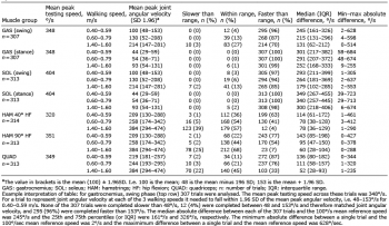 Table II. Joint angular velocity and joint range of motion (ROM) normative reference values for each muscle group and walking speed
