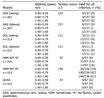 Of the 2,180 trials analysed, 1,296 had a spastic muscle reaction. When compared with the normative joint angles and angular velocities when walking at 0.40–0.59 m/s, only 54/1,296 (4.2%) of trials met all criteria (Table V). When compared with the walking speed of 0.60–0.79 m/s, 123/1,296 (9.5%) of trials met all criteria, and when compared with the fastest walking speed of 1.40–1.60 m/s, 178/1,296 (13.7%) of trials met all criteria. The best, yet still modest, result was for hamstrings at 90° hip flexion, where 19–61% of trials met all criteria, with results more promising when compared with the fastest walking speed.