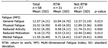 From the 61 patients who were employed at diagnosis, the MFI was completed by 58 patients, 31 RTW and 27 not-RTW. The not-RTW patients reported significantly more fatigue on all fatigue domains than the employed patients. The results are shown in Table III.