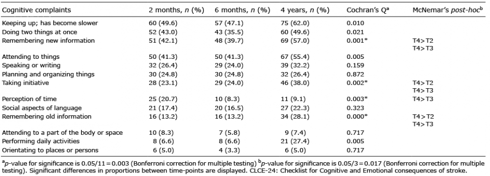 Table II. Proportion of stroke patients with cognitive complaints on separate items of the CLCE-24 at 2 months, 6 months, and 4 years post-stroke (n = 121)