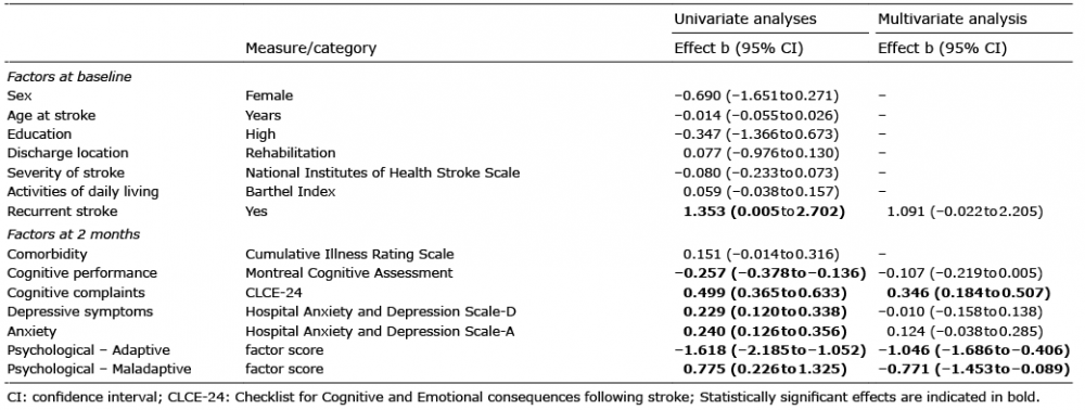 Bivariate analyses showed that a recurrent stroke, worse cognitive performance (MoCA), more SCC (CLCE-24) at T2, more depressive symptoms (HADS-D), more anxiety (HADS-A), lower adaptive psychological score and higher maladaptive psychological score were significantly associated (p < 0.05) with higher scores on the CLCE-24 cognition domain (i.e. more SCC) at 4 years post-stroke (Table III).