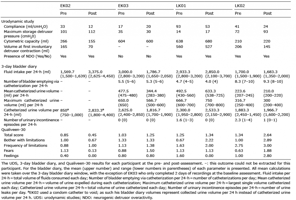The results from the UDS, 3-day bladder diary, and Qualiveen-30 questionnaire are shown in Table III. Changes in UDS outcomes were minor and variable across participants.