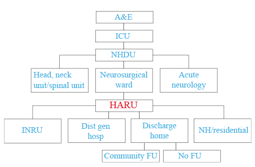 Fig. 1. Flowchart of admission and discharge into the Hyper-Acute Rehabilitation Unit (HARU). An Intermediate Neuro-Rehabilitation Unit (INRU) is a rehabilitation unit that cares for patients with neurological diagnosis and rehabilitation needs. Patients need to be medically stable and able to participate in daily therapies. Patients with tracheostomies are generally not accepted. A&E: Accident and Emergency Department; NHDU: Neuro-High Dependency Unit; Dist gen hosp: District General Hospital; NH: Nursing Home; Residential: Residential Home; FU: follow-up.