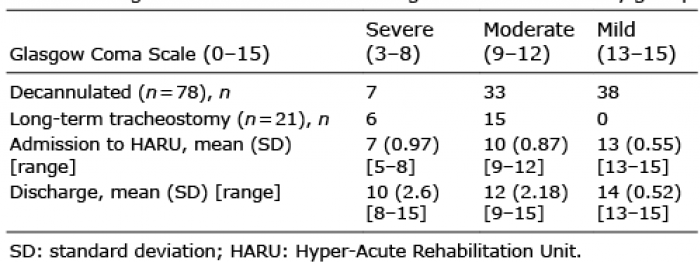 Results: A total of 208 patients were admitted to the HARU, of whom 99 (60 males and 39 females) had a tracheostomy either at admission or during their stay in the HARU. Mean Glasgow Coma Scale