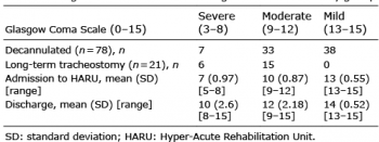 The patients with severe injury GCS at admission had higher rate of long-term tracheostomy. This is in keeping with other studies (15–17). These patients remain as inpatients for a longer duration in any acute ward and need care in a dedicated rehabilitation unit where the complexity of care (including managing the expectations of family and friends) needs to be managed. This requires input from an expert MDT such as that available in a HARU. The transfer of these patients from the HARU to long-term care facilities is likely to be well organized and smooth compared with transfer from acute neurological wards.