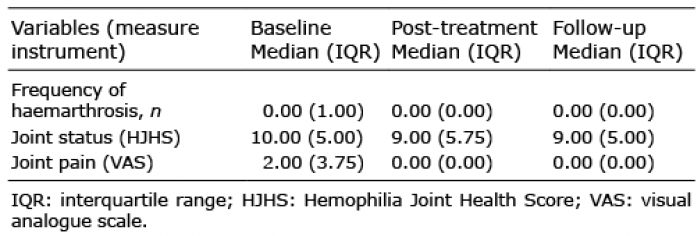 Table IV shows the results of the paired comparison analysis at pretreatment (T0), T1 and T2. Pairwise comparison analysis showed an improvement in terms of frequency of joint bleeding, elbow joint health, and joint pain during the study period. There was a significant improvement (p < 0.001) after the intervention (T0–T1) and at follow-up compared with the baseline value (T0–T2) for all the dependent variables evaluated.